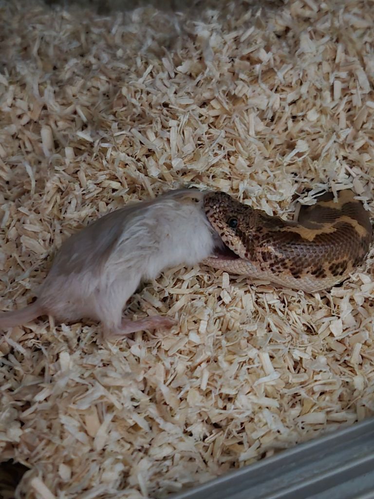 He might be our smallest snake but he doesn’t half make me jump when I feed him. You can barely see a tip of the nose in the substrate (and sometimes not even that much!)…..and then he flies out. Scary but fun 😊