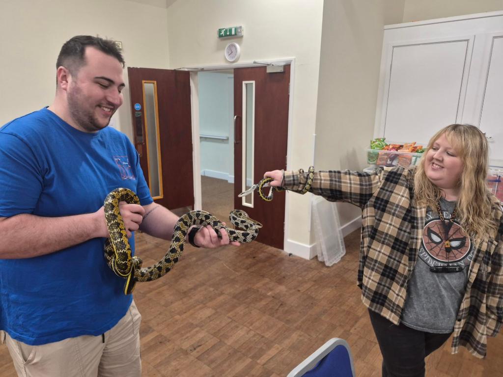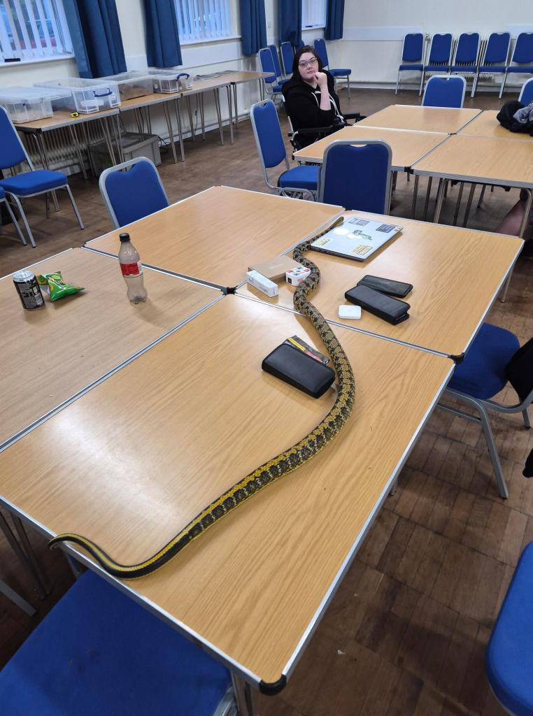 Tarzan joined Izzy and myself at this months’ members meeting for the North West Reptile Club. He is not the most social snake and as many of his species are he is quite flighty and will try and get away. So, whilst I wouldn’t take him to public events yet, he is getting better when I take him to the members meetings and we are getting there slowly but surely. He even met a young female Taiwan Beauty snake called Rukai. Tarzan is nearly 2 years older and as you can see Rukai still has some growing to do!