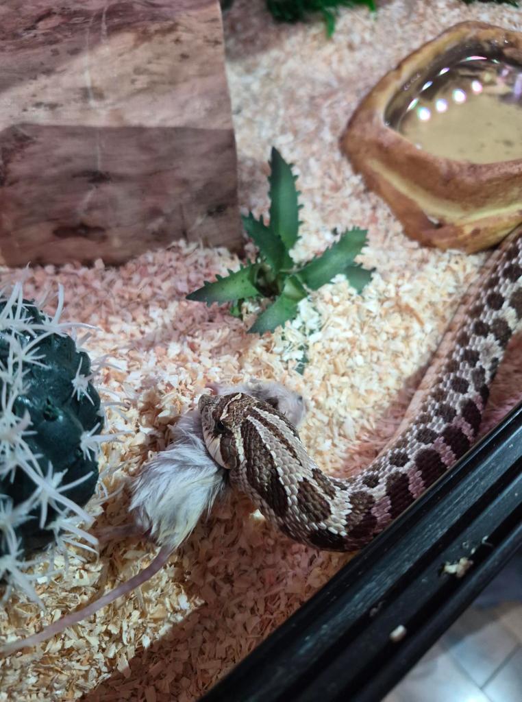 | Hades is a male Western Hognose hatched in 2020. Western hognose snakes are a fossorial (burrowing) species of snake native to the western half of the US, and in some parts of southern Canada and northern Mexico. They prefer shortgrass prairie (grassland), dry rocklands, and coastal inland areas with sandy soil. As a fossorial species, hognose snakes spend a significant amount of time underground. Hognose snakes are popular because of their compact size, but they can be tricky to keep because of their picky eating habits. In the wild they’re toad specialists, and hognose snakes are known to have some trouble digesting prey with too much fur. Providing a variety of different prey keeps mealtime interesting and balances your snake’s nutrition. More notably, hognose snakes are rear-fanged venomous. Their venom is not considered medically significant in humans, but it can cause significant discomfort in bite victims. | |||