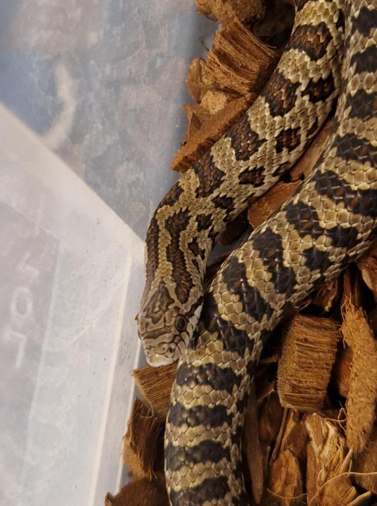 | Mufasa is a male Prairie Kingsnake born in 2022. Also known as the yellow-bellied kingsnake, this is a medium-sized fossorial snake. They are typically active from April through November, being nocturnal in summer and active in the mornings and early evenings in spring and autumn. Its common name can be attributed to its original habitat of prairies. It is grey or light brown in color, with dark brown, dark gray, or reddish brown blotches running down the length of its body. Some individuals have faded patterns that make their bodies appear almost solid brown. The belly is tan or yellowish with blocky brown patterns. The top of the rounded head has a backward-pointing U- or V-shaped marking. The juveniles usually have a dorsal brown stripe along the length of their bodies. There are two black spots behind their head and smaller black spots on both sides along the length of the stripe. If harassed, they shake their tails, which can make a sound similar to rattlesnakes in dry leaf litter. They are averse to biting but often excrete a foul-smelling musk if handled. Threatening also causes them to flatten and appear to have white spots. Often hiding underneath logs, in abandoned structures, debris, and tree trunks, these colubrids are rarely seen due to their secretive nature. | |||